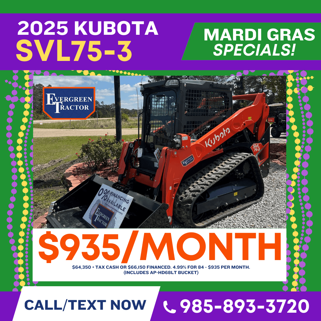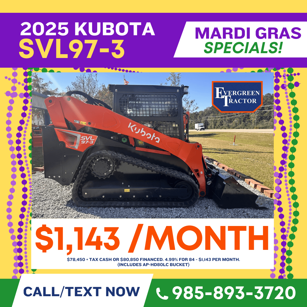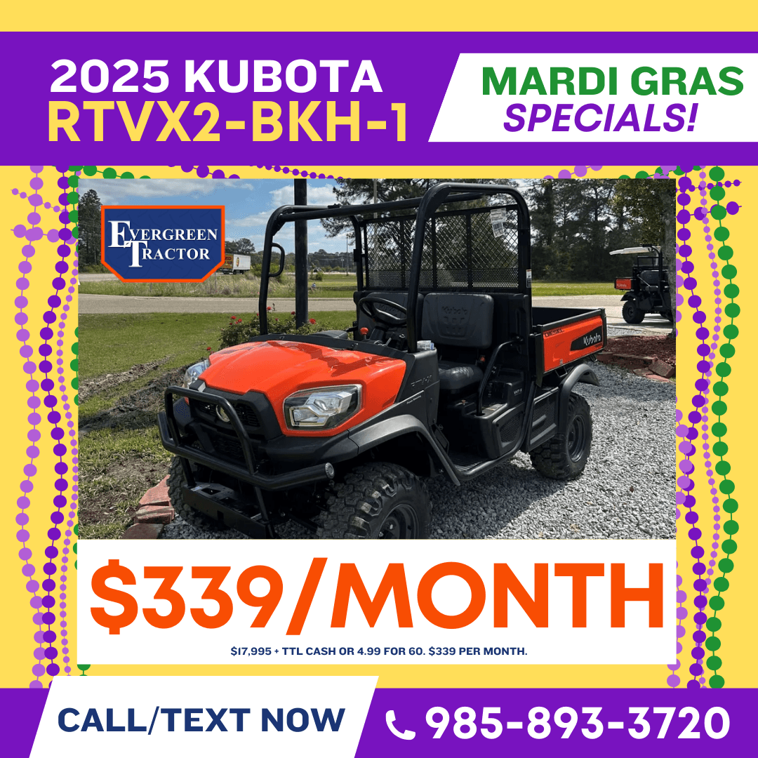 Celebrate Mardi Gras with unbeatable savings on Kubota tractors, Kubota RTVs, and Kubota construction equipment in South Louisiana, serving the Northshore of New Orleans and all of Southeast Louisiana. Our Mardi Gras Savings event brings powerful deals to customers in New Orleans, St. Tammany Parish, Tangipahoa Parish, Washington Parish, Hammond, Covington, Slidell, Mandeville, and surrounding Louisiana communities looking for reliable equipment built to work as hard as you do. Whether you need a compact tractor for land maintenance, a Kubota RTV for jobsite or property use, or durable construction equipment for commercial projects, now is the perfect time to buy. Take advantage of seasonal Mardi Gras specials, competitive pricing, and trusted Kubota performance from a local dealer proudly serving the Northshore and Southeast Louisiana for agriculture, construction, and property owners alike.