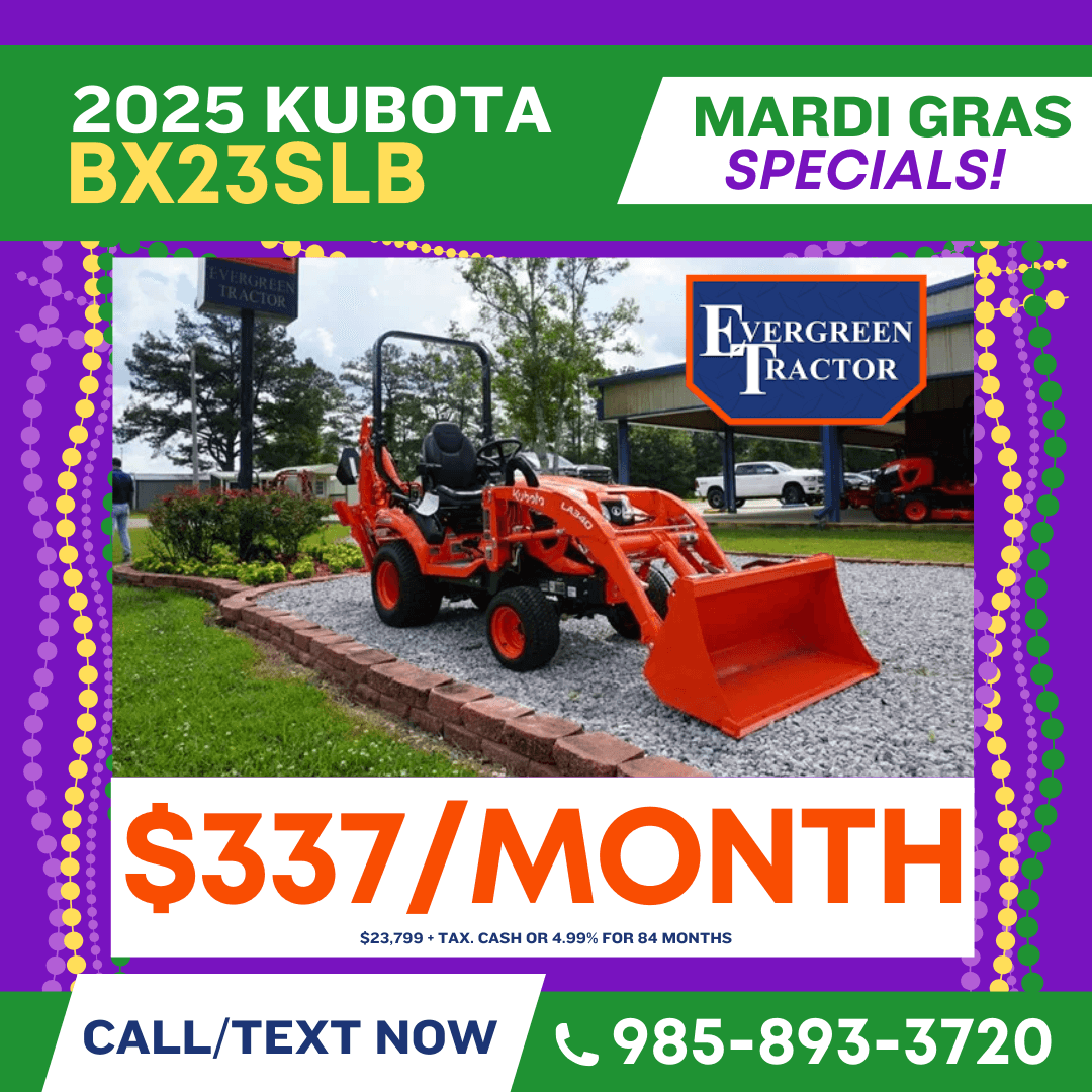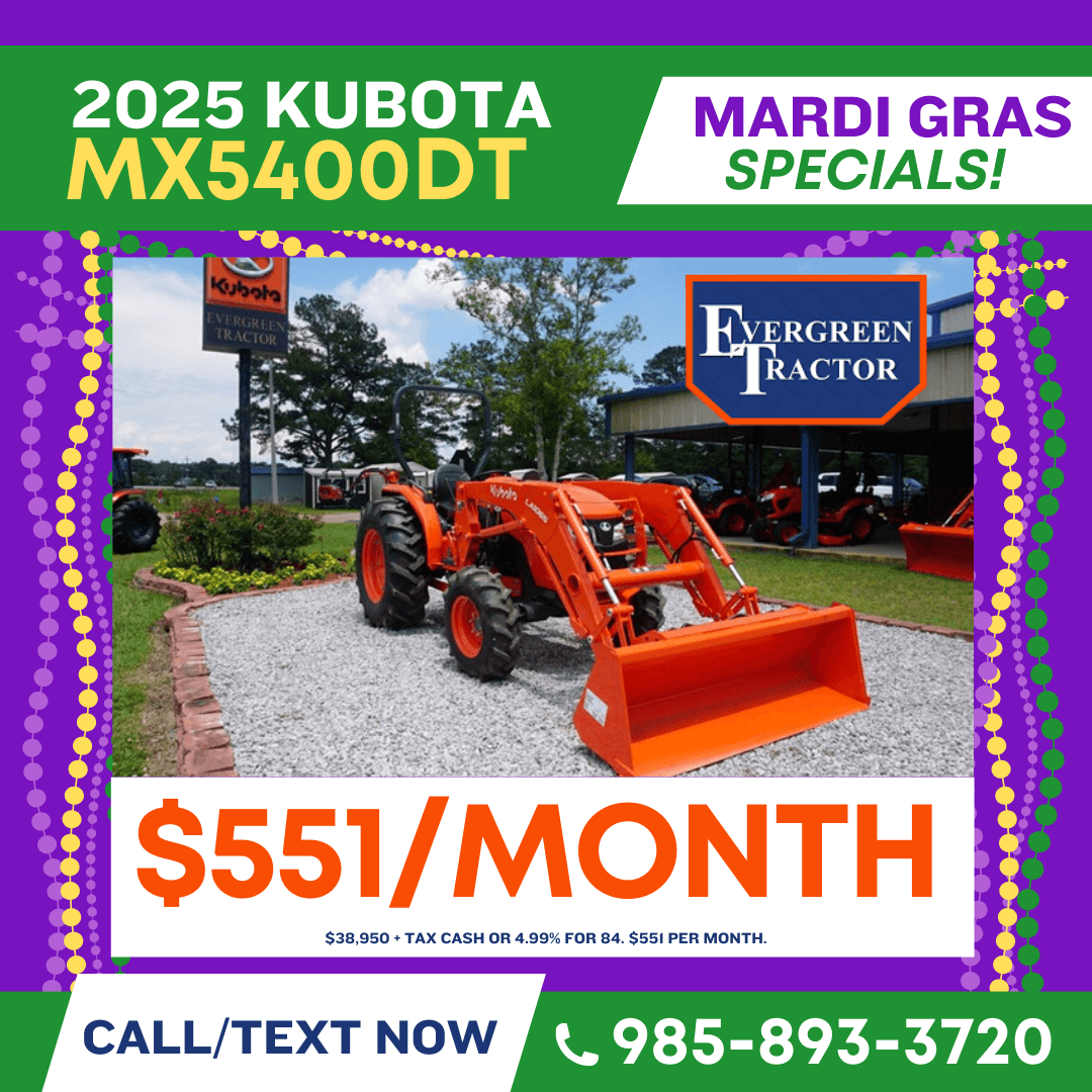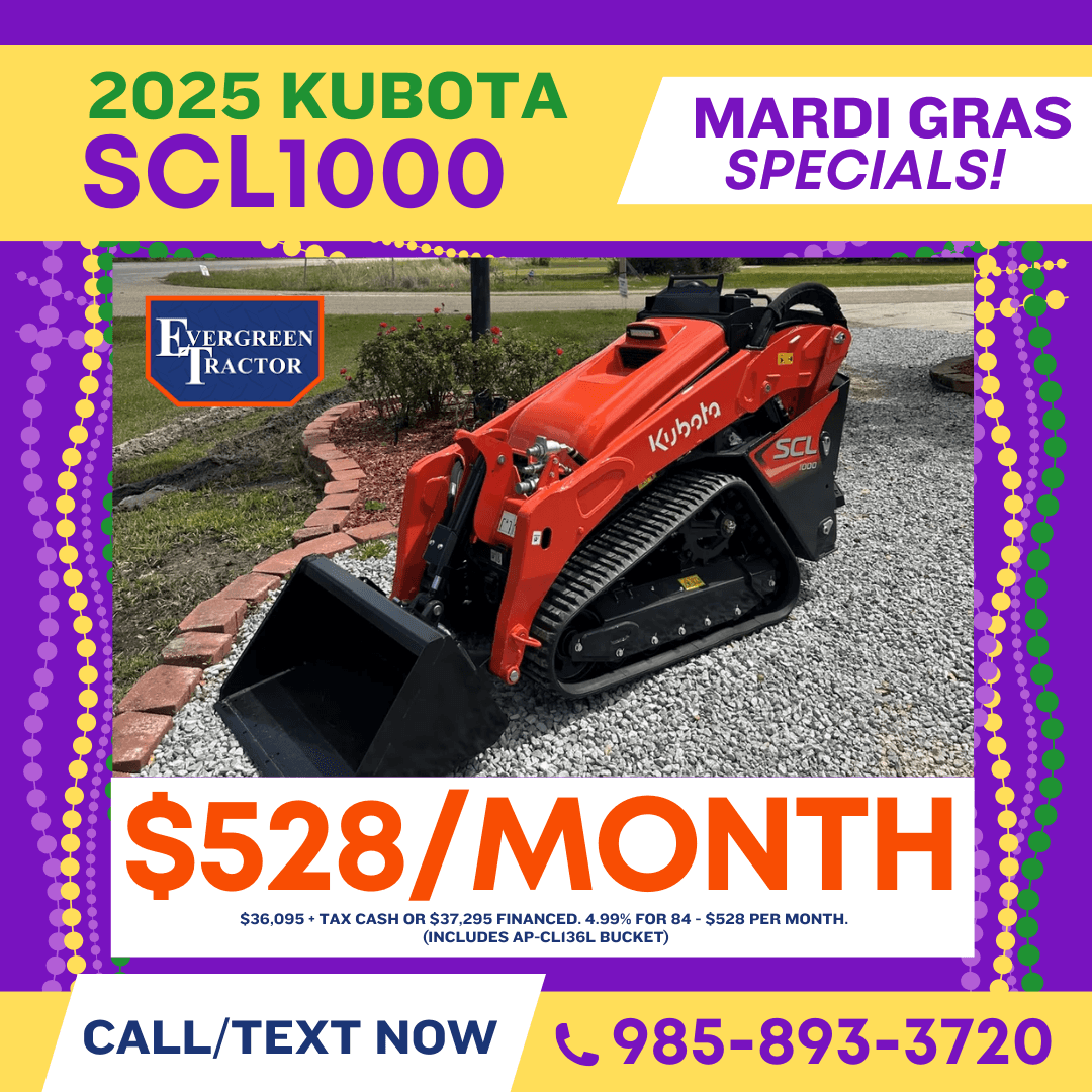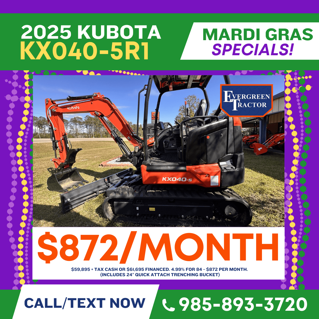Celebrate Mardi Gras with unbeatable savings on Kubota tractors, Kubota RTVs, and Kubota construction equipment in South Louisiana, serving the Northshore of New Orleans and all of Southeast Louisiana. Our Mardi Gras Savings event brings powerful deals to customers in New Orleans, St. Tammany Parish, Tangipahoa Parish, Washington Parish, Hammond, Covington, Slidell, Mandeville, and surrounding Louisiana communities looking for reliable equipment built to work as hard as you do. Whether you need a compact tractor for land maintenance, a Kubota RTV for jobsite or property use, or durable construction equipment for commercial projects, now is the perfect time to buy. Take advantage of seasonal Mardi Gras specials, competitive pricing, and trusted Kubota performance from a local dealer proudly serving the Northshore and Southeast Louisiana for agriculture, construction, and property owners alike.